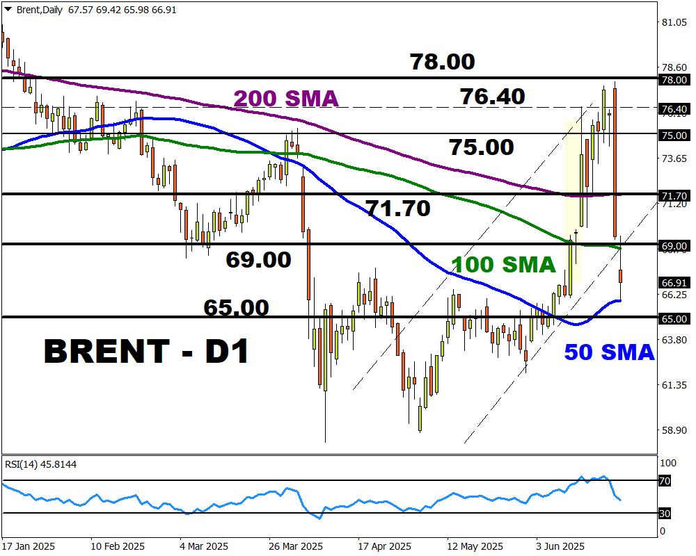 One of the major drivers initially powering oil prices was potential disruptions through the vital Strait of Hormuz channel. Oil benchmarks have shed almost 15% this week with Brent eyeing support at $65.00.