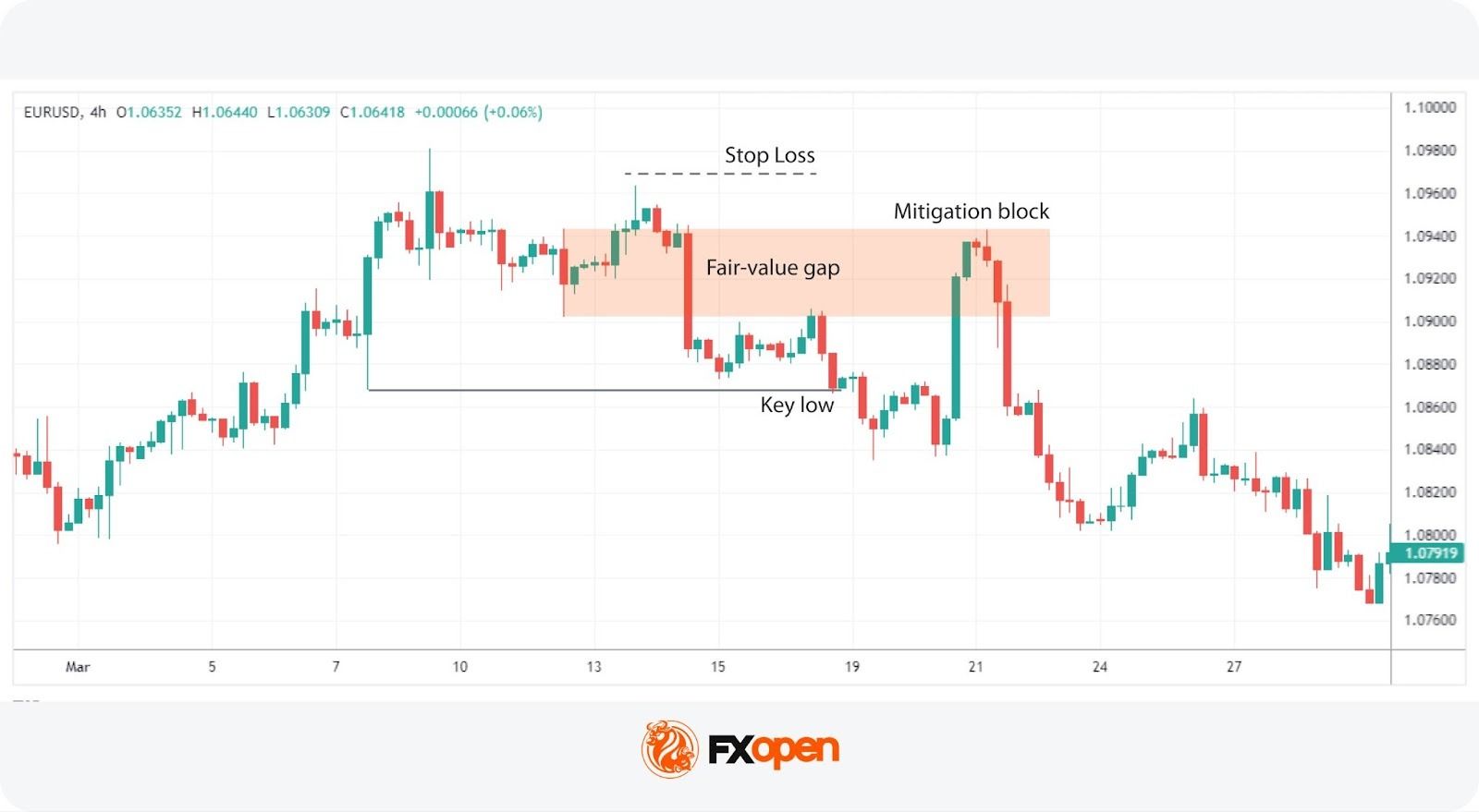 - Bearish Mitigation Block: This type forms during an uptrend and is identified by a significant peak followed by a decline and a failed attempt to reach or surpass the previous high, creating a lower high. When prices drop below the previous low, the price zone above the low becomes mitigation. It may be characterised by an increase in selling volume as the price approaches the level, signalling resistance and a potential downward reversal.