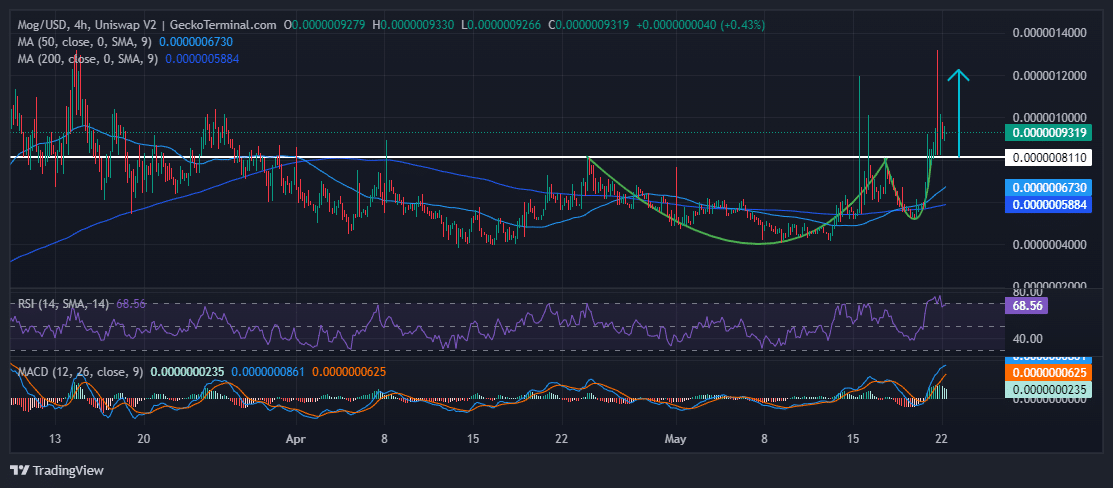 The MOG coin price analysis on the 4-hour chart shows a bullish bias, with the bulls aiming to sustain its momentum over the cup and handle pattern.