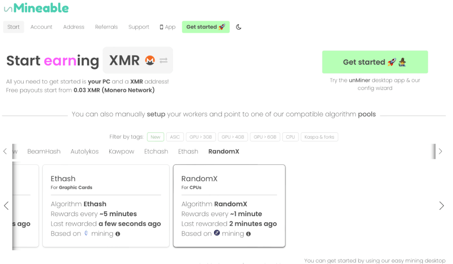 - When you click on Monero, you’re going to see a few options. What you need is RandomX. Click on it, and in the list of options click on ‘Get started with xmrig.’