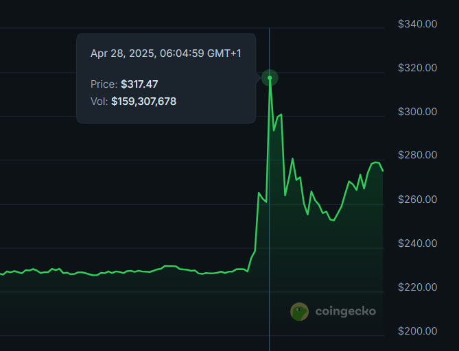 Monero, a private blockchain network and token that allows users to make secure, private transactions, surged over 50% on April 28, 2025, and maintained its new price peak into early May.