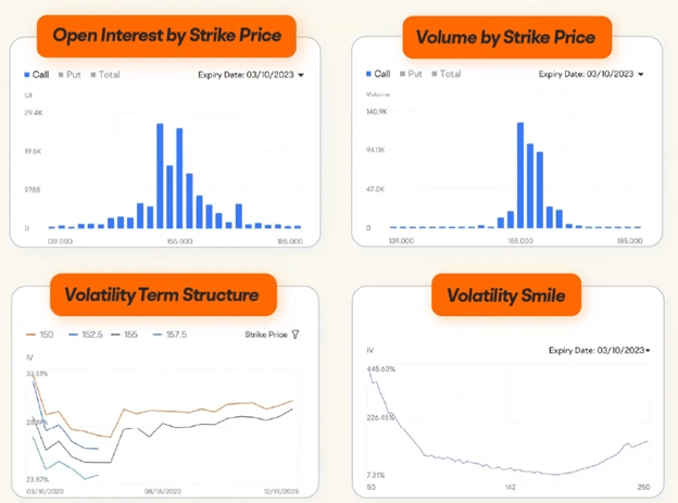 For liquidity analysis, traders can view open interest and volume by strike price to ensure adequate trading activity before entering positions.