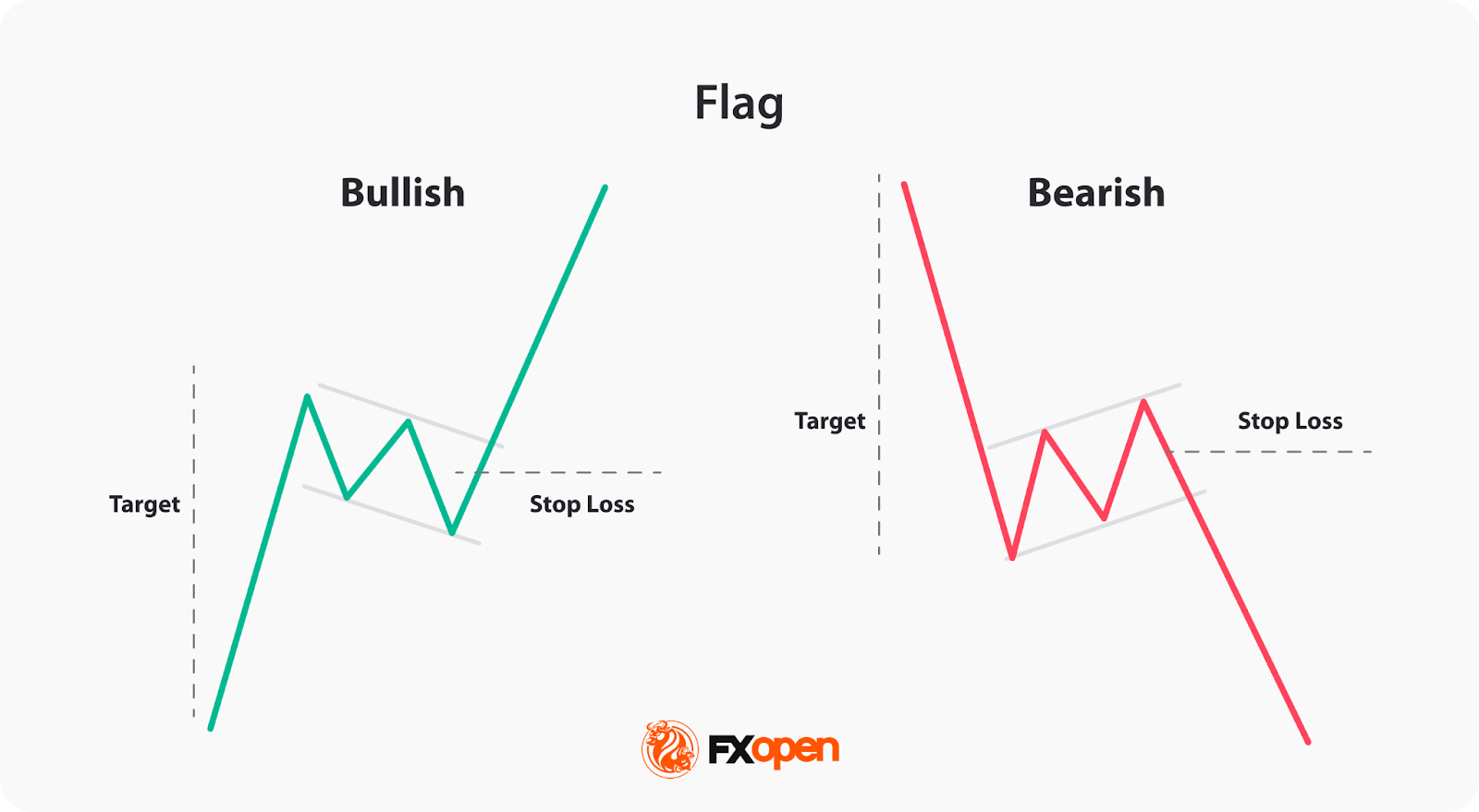 Bullish and bearish flags are important when learning how to read forex charts. These are continuation patterns appearing during an existing uptrend or downtrend, respectively. Flag patterns resemble a flag on a pole, with two parallel lines sloping downward/upward, acting as support or resistance. Entry: Traders may consider initiating long/short positions when the price breaks above/below the resistance/support level within the bullish/bearish flag.