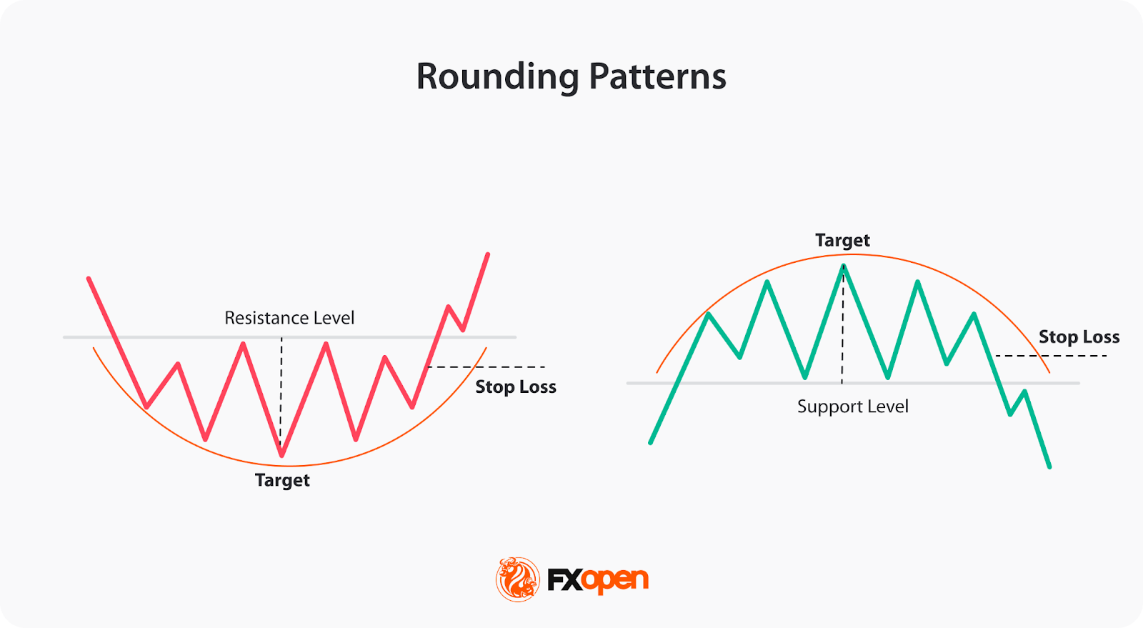Rounding top and rounding bottom patterns are reversal patterns in forex trading. The rounding top is a bearish reversal pattern appearing in an uptrend, while the rounding bottom is a bullish reversal pattern appearing in a downtrend. Both patterns are characterised by a gradual curve in price action, resembling the shape of a rounded top or bottom, which signifies a shift in market sentiment.