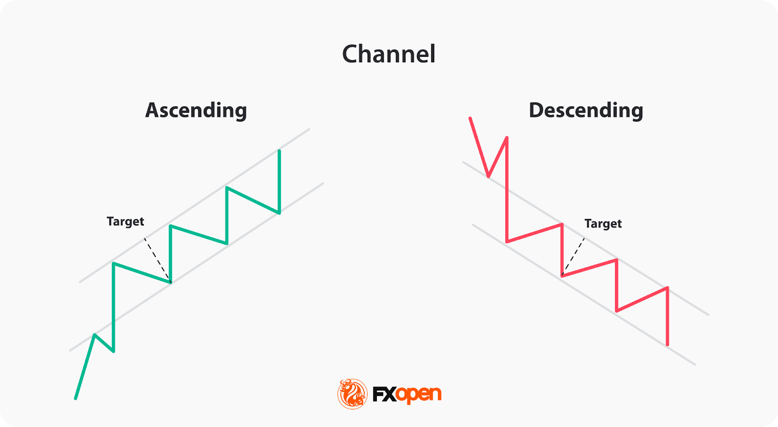 This pattern features two parallel trendlines, with the lower trendline serving as support and the upper trendline acting as resistance. The price tends to move between these lines, signifying an uptrend/downtrend, forming higher highs and higher lows and lower highs and lower lows, respectively.