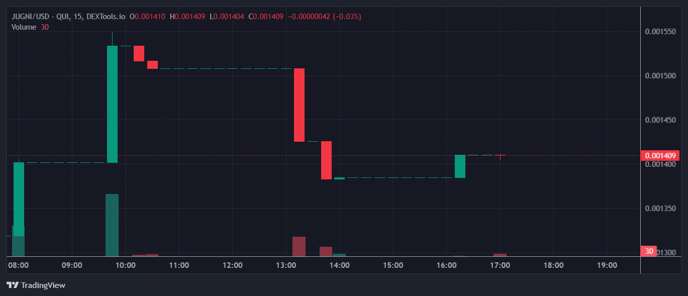 Currently, the live price of Jugni is approximately $0.0014, with a market capitalization of around $134.04K. In the last 24 hours, the token has recorded a trading volume of $3.46K, showing a notable increase of 34.89%. The circulating supply stands at 94.94 million JUGNI coins, which is also the maximum supply, indicating complete distribution.