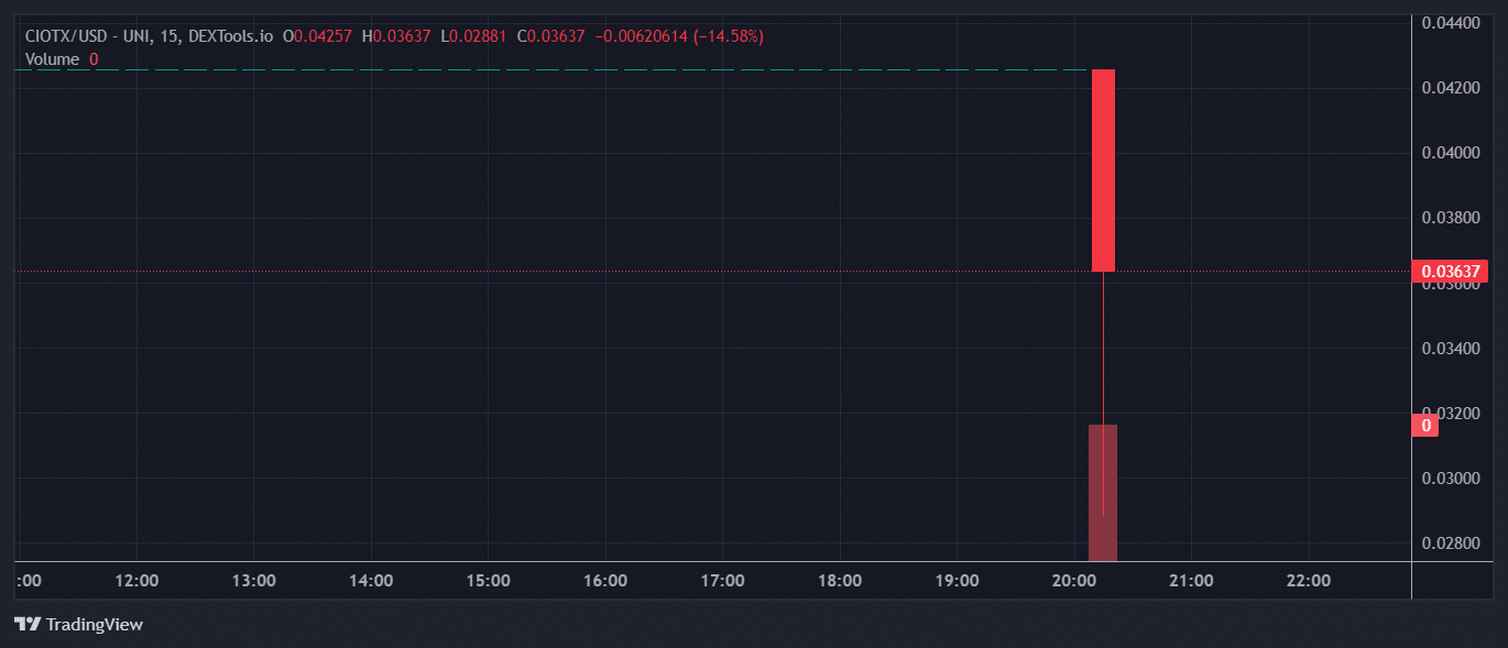 Analyzing the 15-minute candlestick chart for the CIOTX/USD pair reveals significant price movements. The current price of $0.03637 reflects a decline of 14.58% from the opening value.