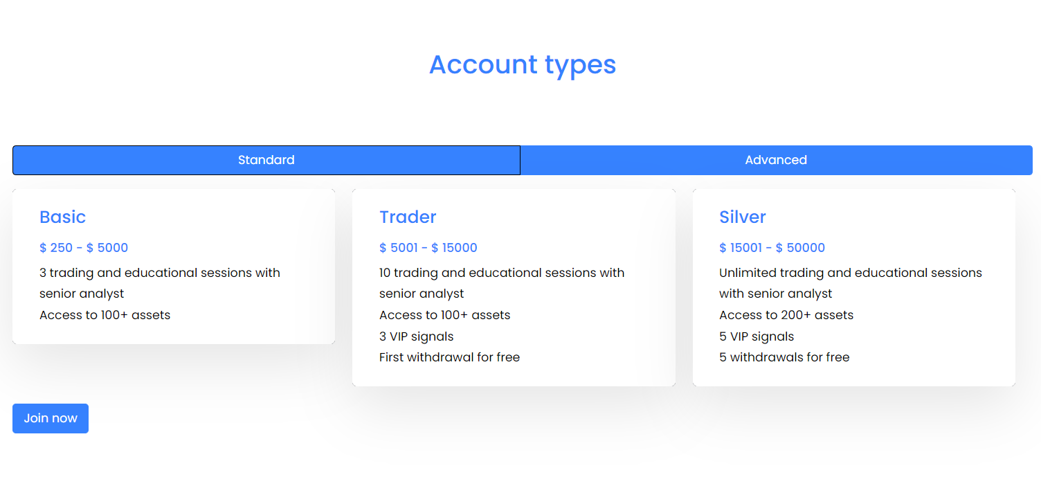 The second one is Advanced, which includes Gold, Platinum, and Diamond. As its names suggest, they are designed to cater to pros. On top of the features we have listed down above, those owning these accounts qualify for more regular VIP signals, free withdrawals, and higher leverages. Additionally, Diamond, the highest account tier, introduces exclusive financial advisor services for customers who are interested.