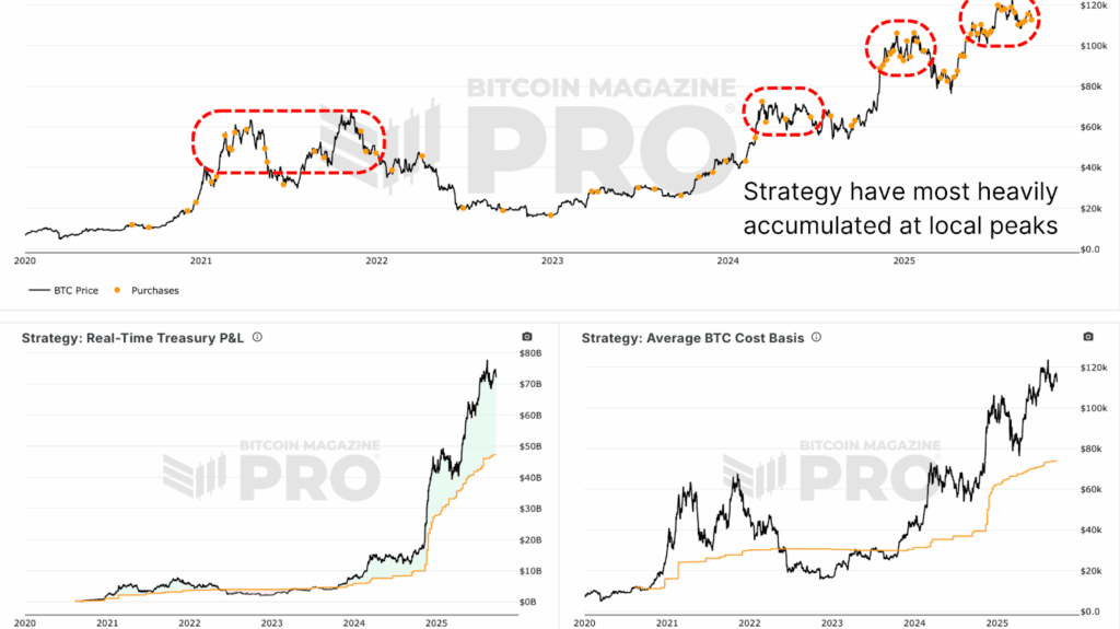 MSTR (Strategy) remains the clear leader among corporate Bitcoin holders, with almost 640,000 BTC. Across all Top Public Bitcoin Treasury Companies, over 1 million BTC is now effectively locked away, a dynamic that permanently reduces liquid supply and strengthens Bitcoin’s monetary premium (assuming, of course, they never sell!) While this has been a huge net positive for Bitcoin’s supply-demand economics, the data shows that a large share of these purchases occurred during overheated market conditions, particularly at local peaks.