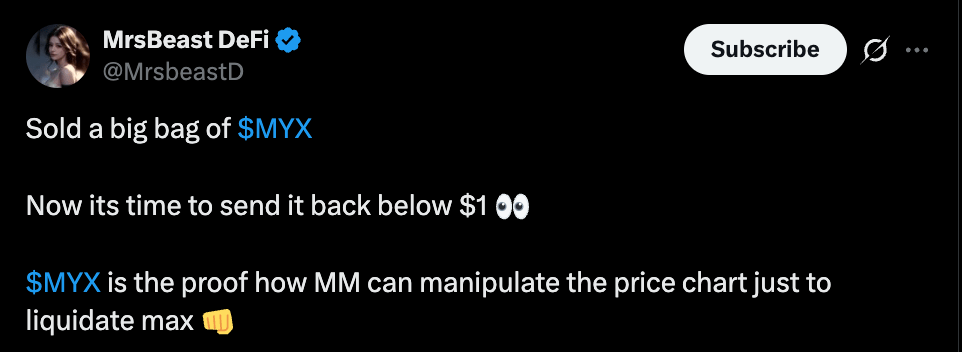 Several independent analysts have voiced strong concerns about the sustainability of MYX’s explosive rise. MrsBeastDeFi, a prominent technical voice on social media, has already sold most of her holdings and expects a brutal correction to follow. In her view, MYX could eventually fall below one dollar, as she describes the current rally as heavily manipulated to liquidate short traders. Her comments highlight the fear that market makers are deliberately pushing the chart higher to trap leveraged positions.