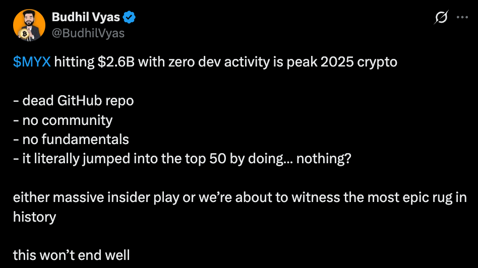 Budhil Vyas, a data scientist featured on CNBC, also questions the token’s fundamentals. He has criticized MYX’s $2.6 billion valuation and pointed to a dead GitHub repository, lack of developer activity, and weak community presence. For him, the project reflects peak 2025 crypto behavior where hype outweighs substance. His conclusion is stark: this could either be a massive insider play or end up as one of the largest rug pulls in history.