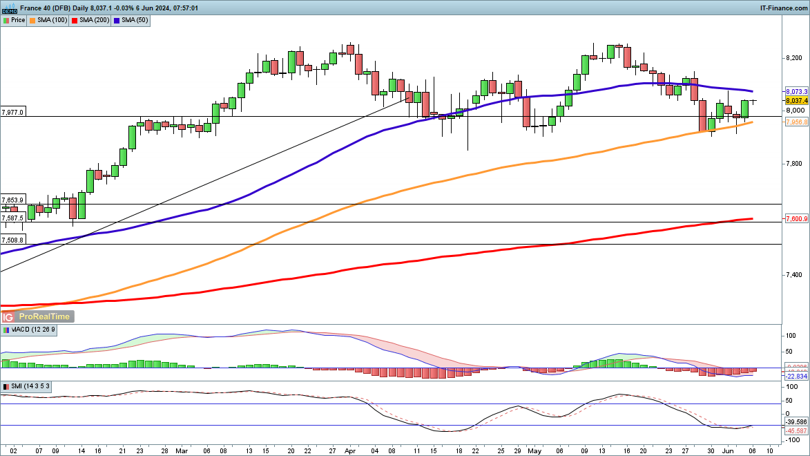 This past week, the CAC 40 found support near 7900, mirroring its performance in April and May. If this support level holds, the index is poised for a rebound towards the 8250 peak observed in the preceding months, which could restart the uptrend and potentially reach new highs.