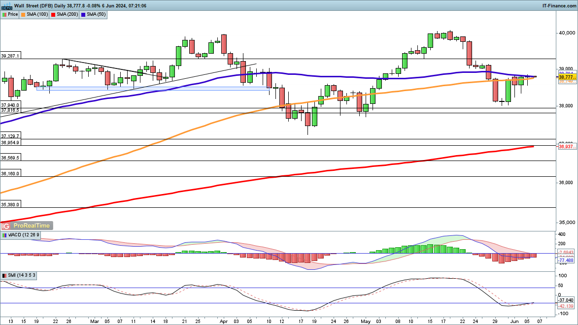 Conversely, a fall below 38,500 could lead to a retest of the 38,000 level, and possibly down to the April low of 37,236.