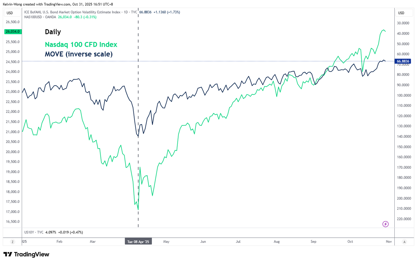 Since the aftermath of the U.S. “Liberation Day” reciprocal tariffs on 8 April 2025, the inverse of the MOVE Index has tracked the Nasdaq 100 in near lockstep, highlighting how declining bond market volatility has supported risk-on sentiment and reinforced short-term equity momentum.