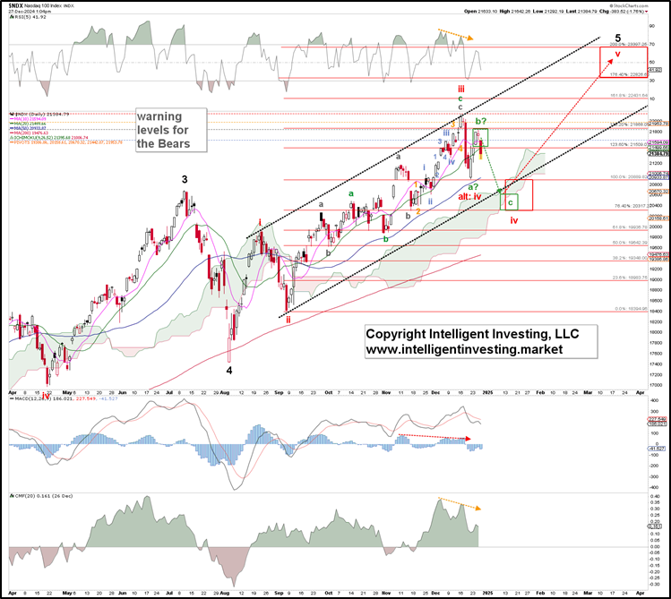 Fast-forward: After our update, the index didn’t break below NDX21200 but continued to NDX22133 by December 16, thus slightly exceeding the $21868 level. However, FED-Wednesday, December 18th, erased the prior ten days of gains. Following the continued rally, we had already raised the warning levels for our Premium Members to NDX21600, and thus, no harm was done.
