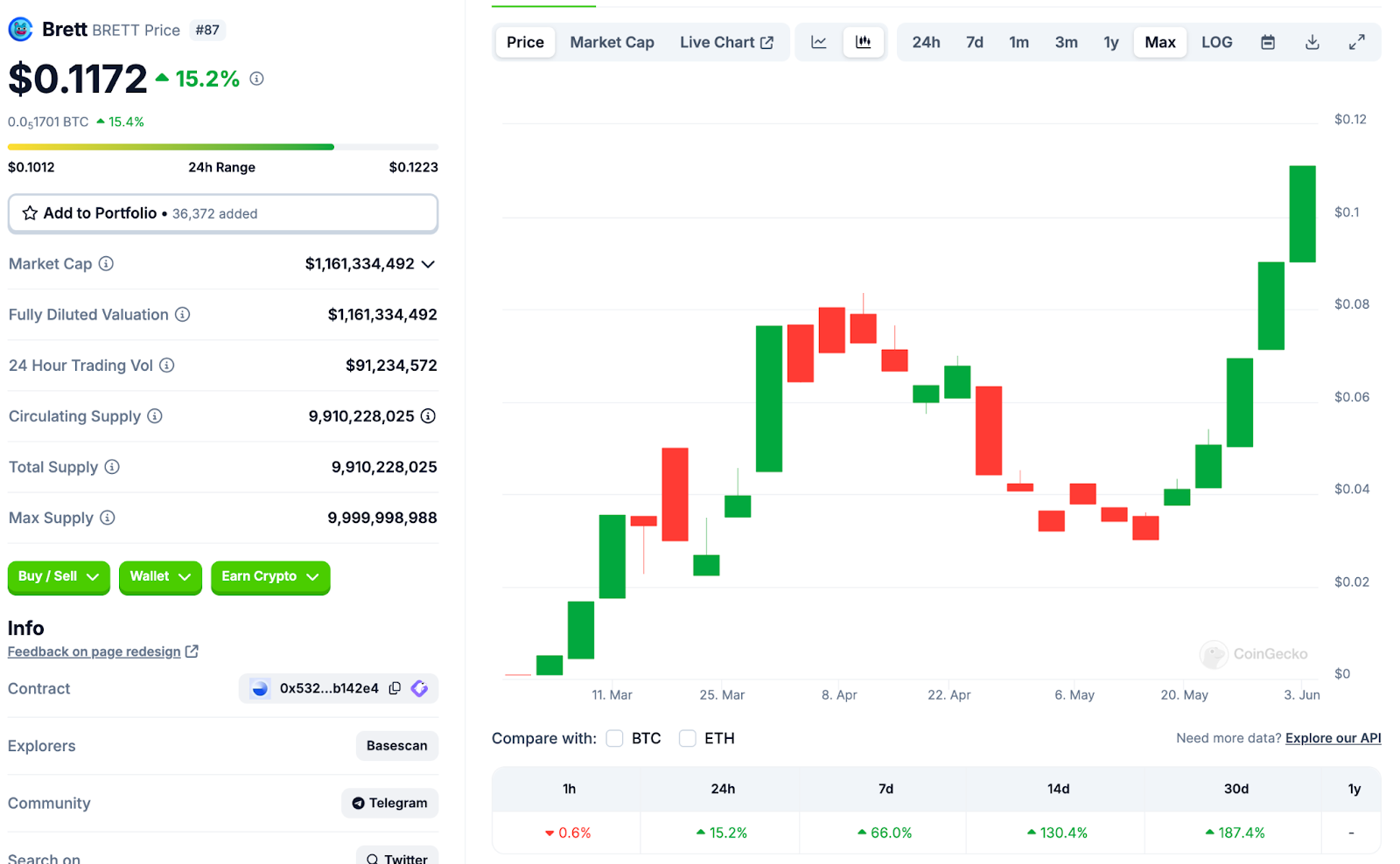 $BRETT is still trading at levels comfortably above $1 billion market cap, printing a price of $0.1182, up 22% in the past 24 hours alone at the time of writing (4 June).
