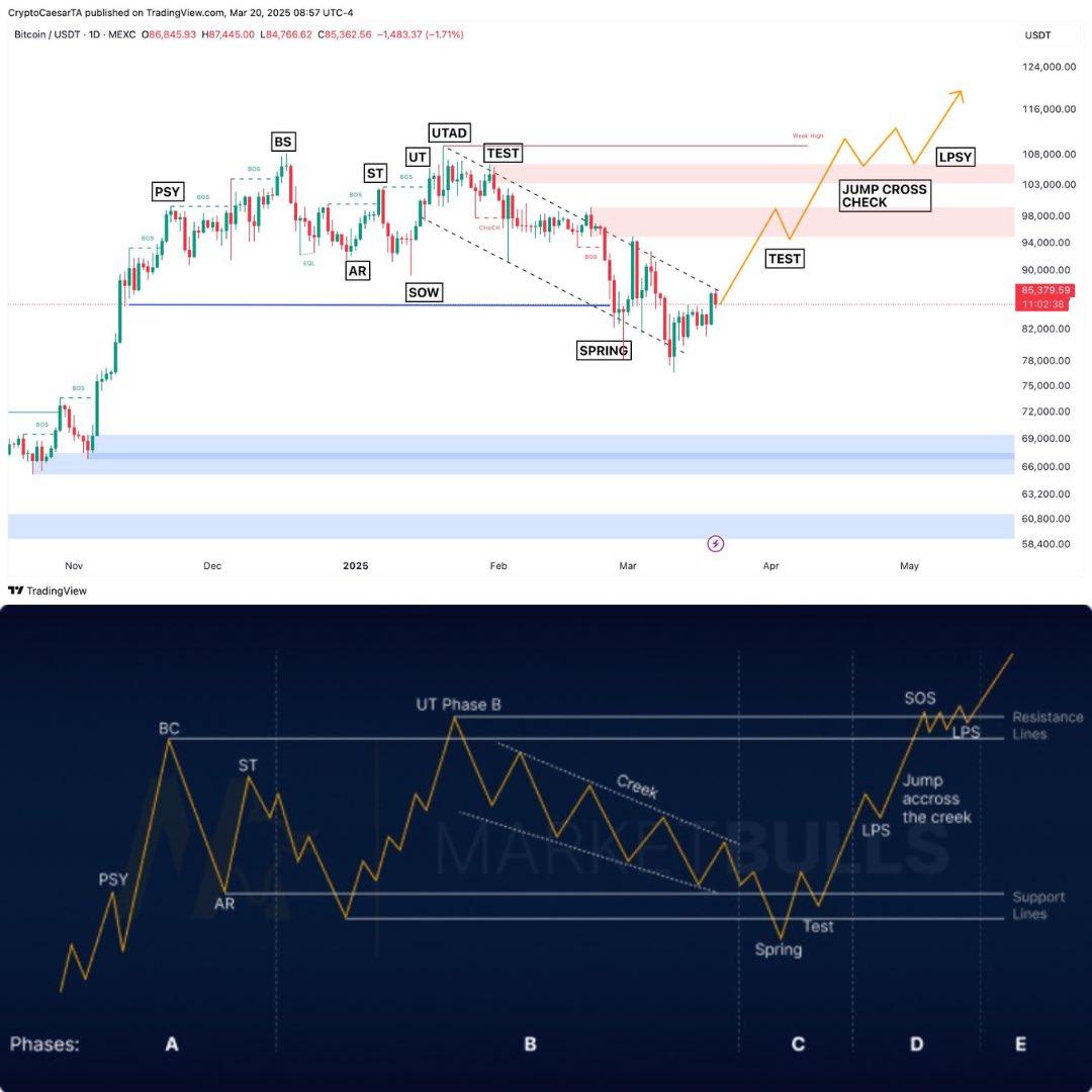 Meanwhile, technical analysts also remain optimistic about Bitcoin’s trajectory. Crypto Caesar highlighted that BTC has entered a “spring” phase, as shown in a Wyckoff Method chart he shared on Thursday. This phase signals the shift from accumulation to a markup phase, indicating a potential breakout above the $88,000-$89,000 resistance, with a target of $96,000.