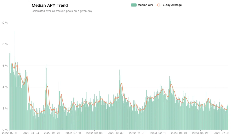 The collapse of Three Arrows Capital exposed a critical issue in the crypto industry: the lack of sustainable yield-generating opportunities for crypto assets.. As the Fed began raising interest rates and global market liquidity tightened, cryptocurrencies, classified as a high-risk asset class, were hit especially hard. In contrast, RWAs (like U.S. Treasury bonds) have steadily increased in rate of return since the end of 2021, drawing market attention. From 2022 to 2023, the median DeFi return dropped from 6% to 2%, falling below the 5% risk-free returns of U.S. Treasury bonds during the same period. As a result, high-net-worth investors lost interest in on-chain returns. With diminishing on-chain returns, the industry began shifting its focus to RWAs, hoping to revive the market by introducing stable, off-chain returns.