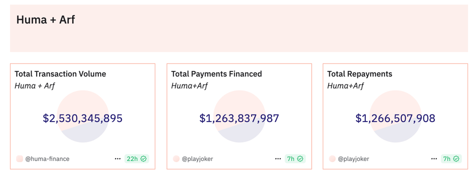 Huma primarily serves clients from developed countries like the UK, the US, France, and Singapore, where bad debt rates are extremely low. Repayment cycles range from 1 to 3 days, with fees calculated daily. Fund flows are transparent and efficient. To date, Huma has facilitated $2 billion in transactions with a 0% bad debt rate. Its partnership with Arf has delivered impressive double-digit returns, entirely independent of tokens.