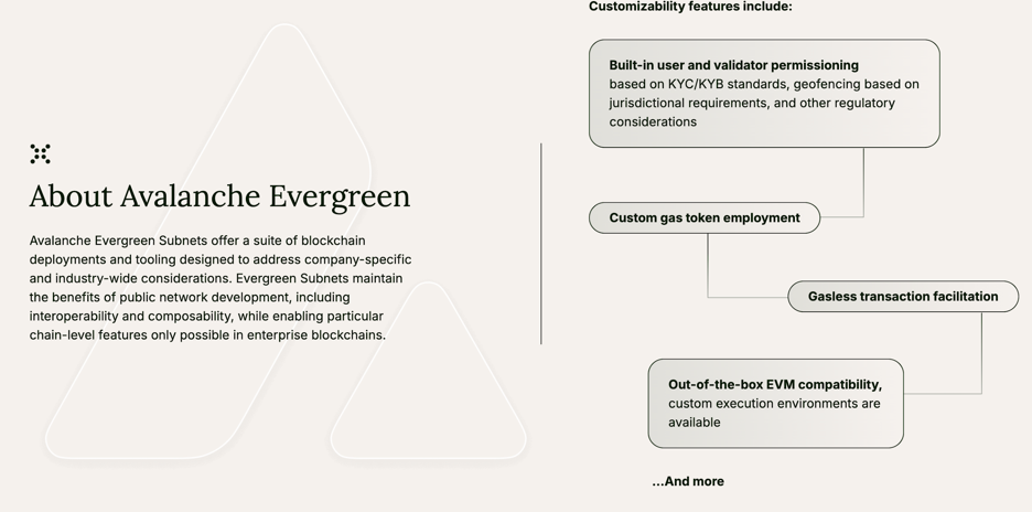 Avalanche is the first L1 public chain to fully embrace RWAs and has been actively exploring enterprise applications since the end of 2022. Its unique subnet architecture allows institutions to deploy custom blockchains optimized for specific use cases while maintaining seamless interoperability with the Avalanche network. It has unrestricted scalability. Between late 2022 and early 2023, entertainment giants from South Korea, Japan, and India began building subnets on Avalanche. Avalanche also keenly captured Hong Kong’s momentum in asset tokenization. In April 2023, it launched the Evergreen subnet during the Hong Kong Web 3.0 Summit, offering financial institutions dedicated tools and services for blockchain deployment. This initiative facilitates settlements with authorized counterparties on private chains while ensuring interoperability through Avalanche Warp Messaging (AWM). Institutions like WisdomTree and Cumberland have been drawn to participate in the Spruce testnet.