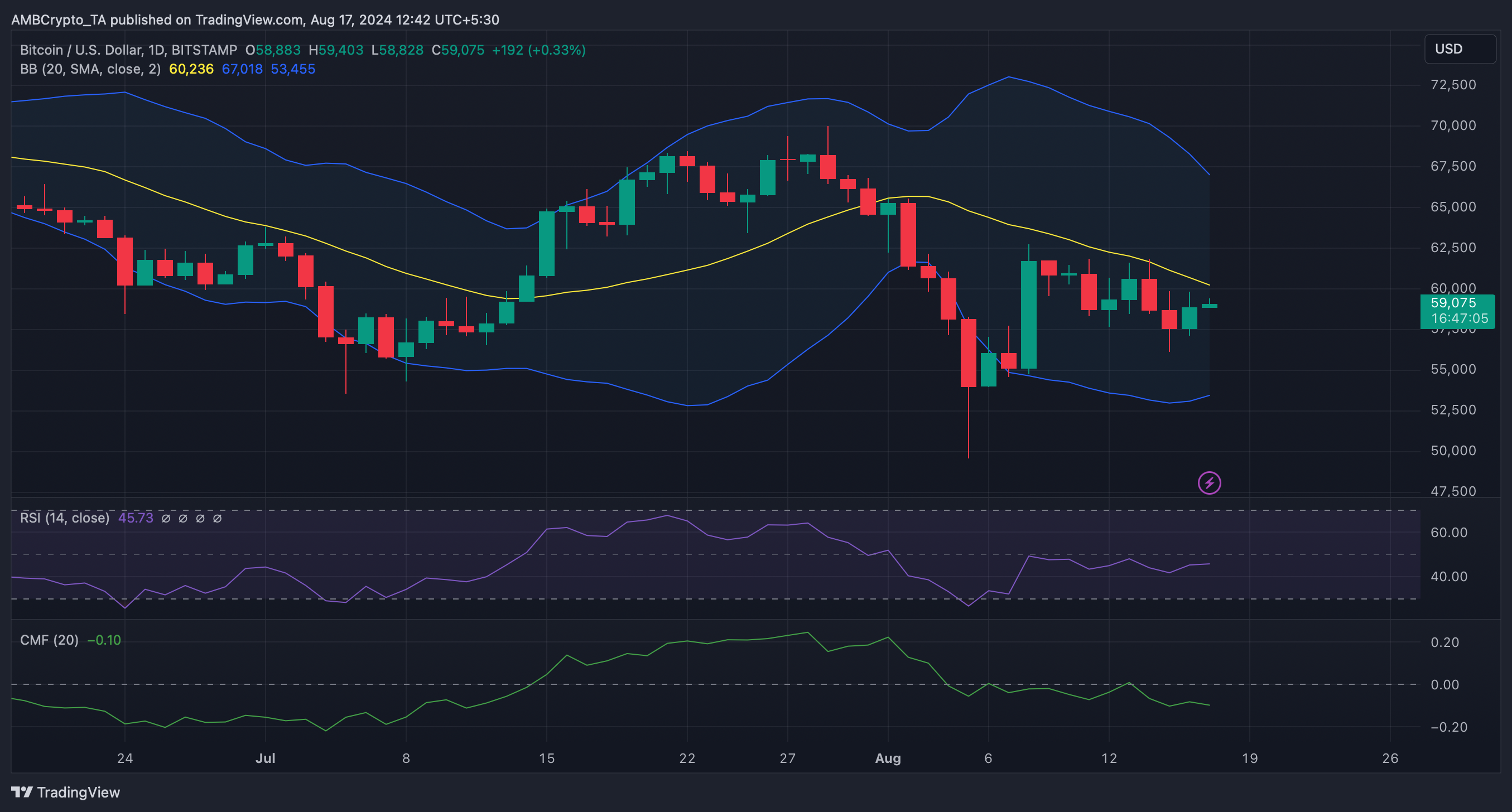 The Bollinger Bands revealed that BTC was about to test its resistance near the 20-day Simple Moving Average (SMA).