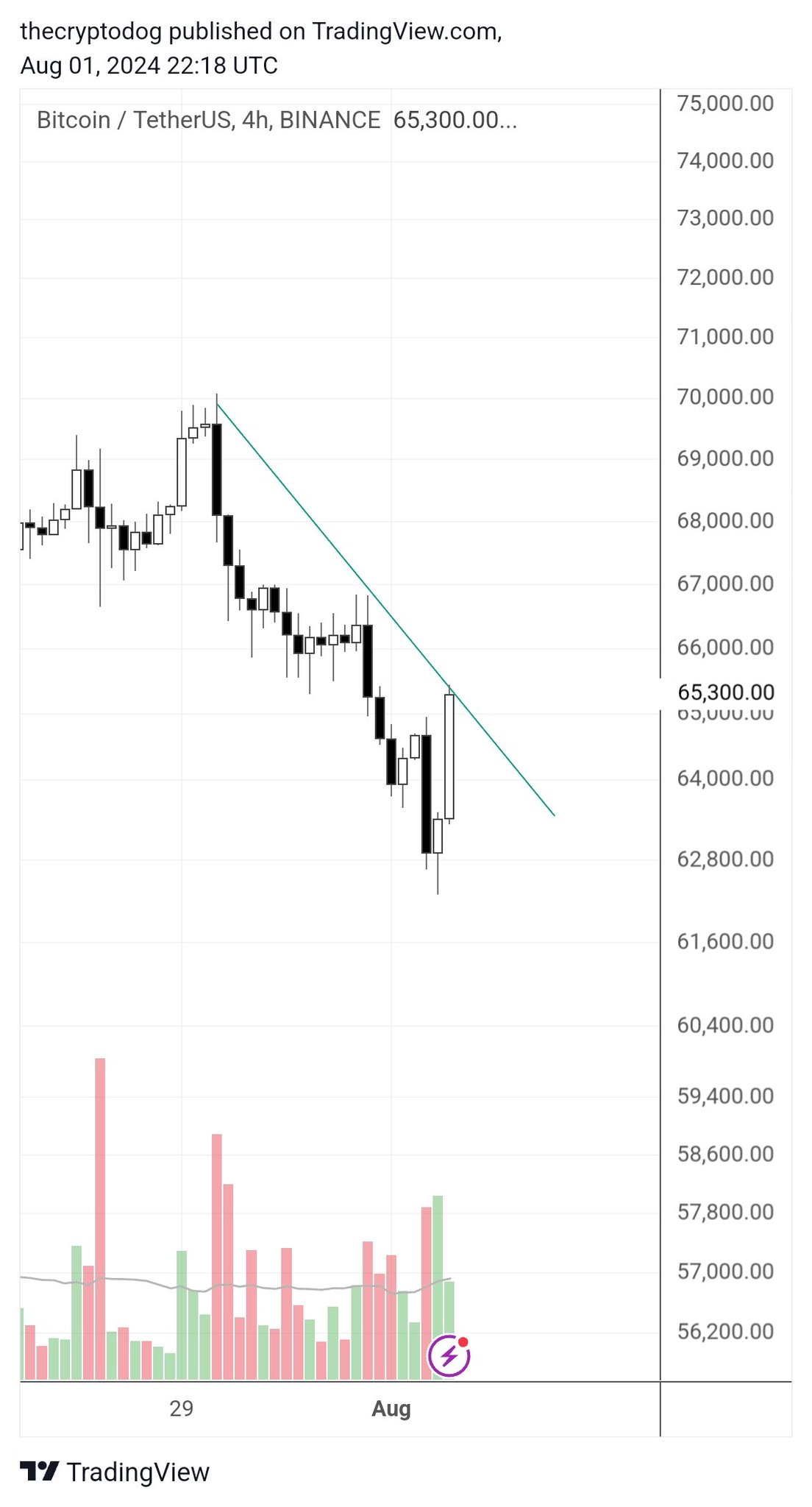 Pseudonymous analyst The Crypto Dog tells his 804,500 followers on the social media platform X that he’s looking at $65,000 as the level where momentum fully swings back to the side of BTC bulls.