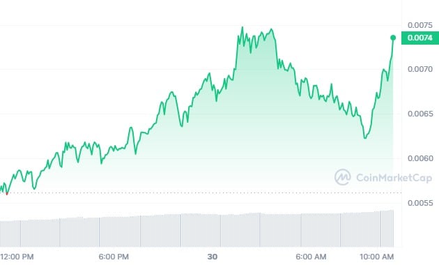 Just 24 hours ago, DOG reached a new all-time high of $0.006218, pushing its market capitalization to $600 million for the first time. As of now, the price has increased further by 31.04% to $0.007355.