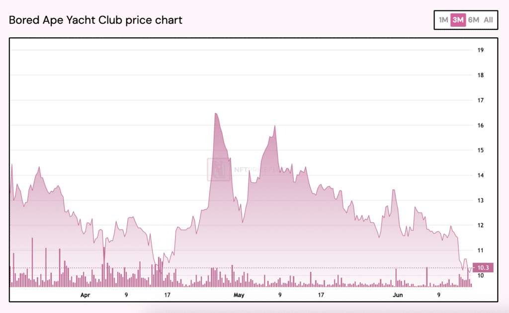 After peaking at 13.7 ETH on 31 May, the floor price of an NFT in the BAYC collection has since declined by 25%, as per NFTPriceFloor.