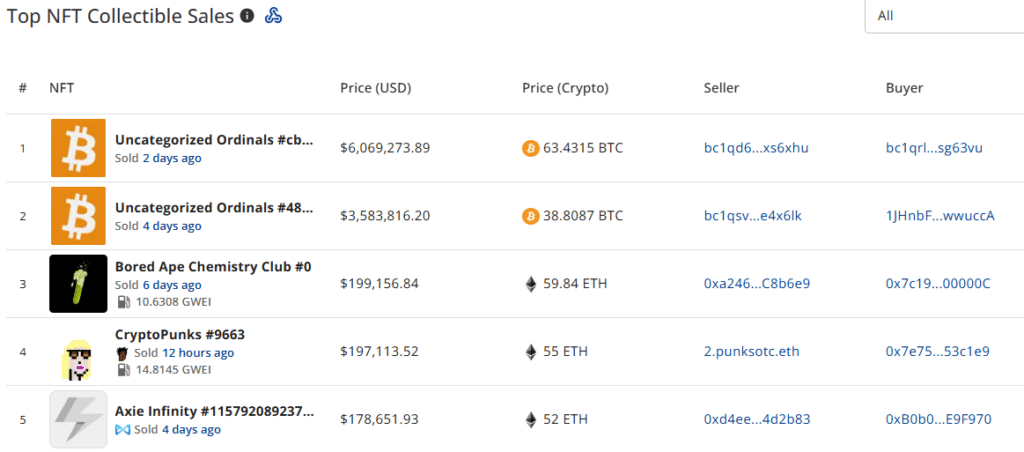 The latest data shows several large individual NFT sales: