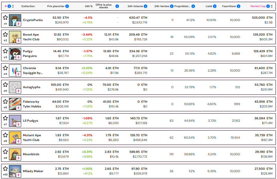 Among the most popular collections are CryptoPunks, which remain at the top with a market capitalization of $2.4 billion. They are followed by Bored Ape Yacht Club (BAYC) and Pudgy Penguins, as seen in the ranking above.