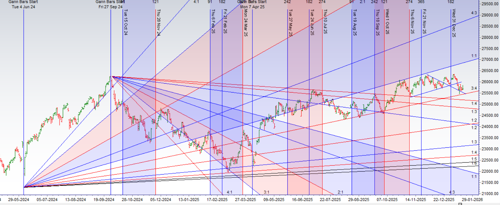 Price took support at falling gann angle now holding 25700 rally back to 26 K