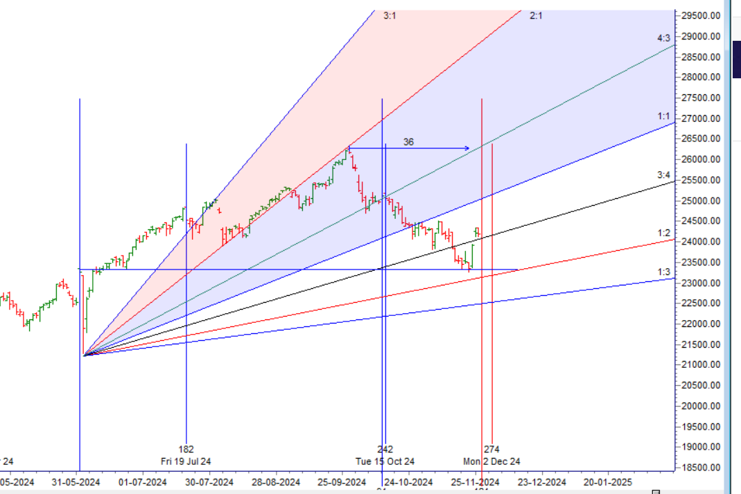 The impact of Astro and Gann Cycles, which we have been discussing in previous analyses, led to a sharp rally in Nifty. From a low of 23,263, the index rallied to 24,351 in just three trading sessions.