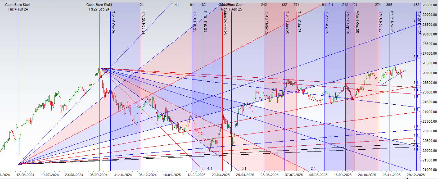The Bearish Objective (The Knockout Blow): The bears are in a position of strength. Their objective is simple and direct: break the 25,711 support level. A decisive move and close below this Gann octave point would be a major technical breakdown, likely triggering a rapid and high-momentum decline towards 25,500.
