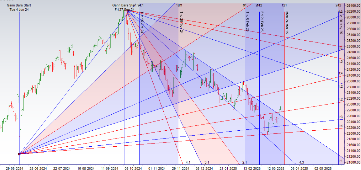 India’s inflation rate dipped to 3.61%, lower than expected, boosting market sentiment. Nifty has held the Gann Trend Change level of 22,336 for the past two trading sessions, reinforcing this as a crucial support zone.