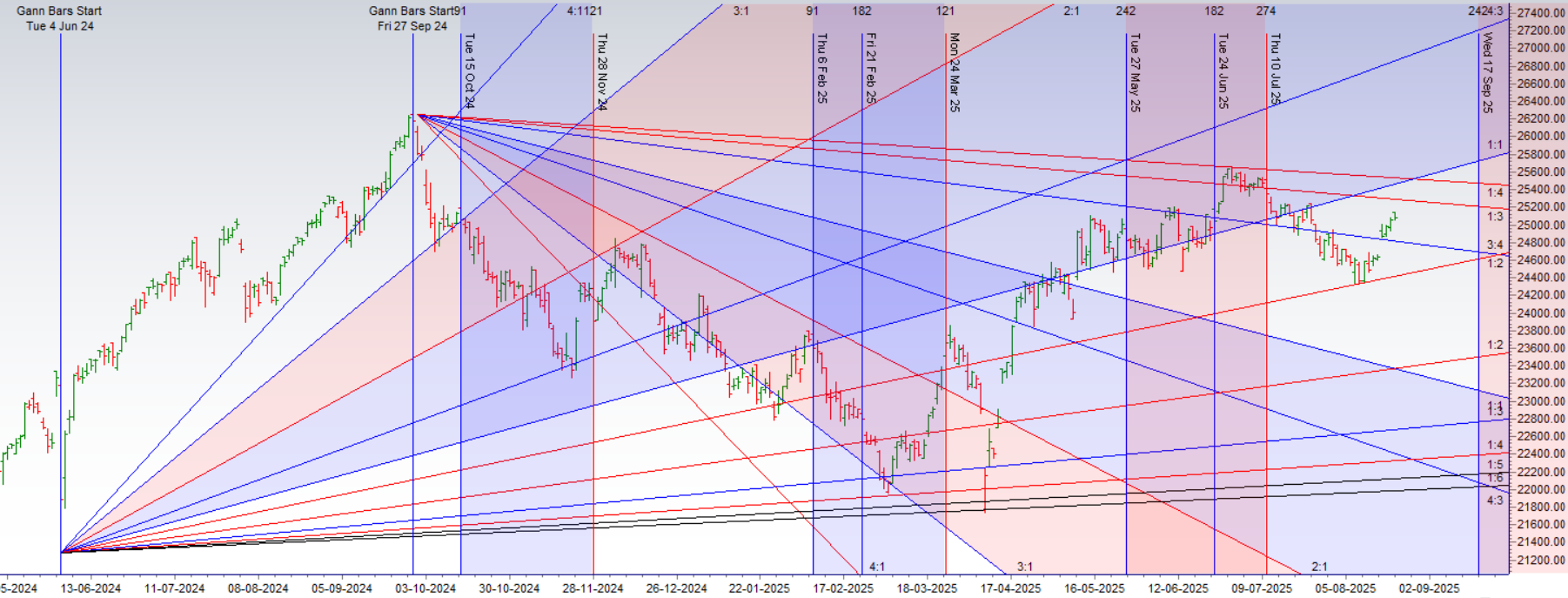 After a blistering six-day rally, the Nifty has finally paused, and it’s not by accident. The index has run into a formidable and rather esoteric level of resistance: 25134, a key “Musical Octave” level. This isn’t just another line on the chart; it’s a point of harmonic resonance where the market’s energy is known to shift.
