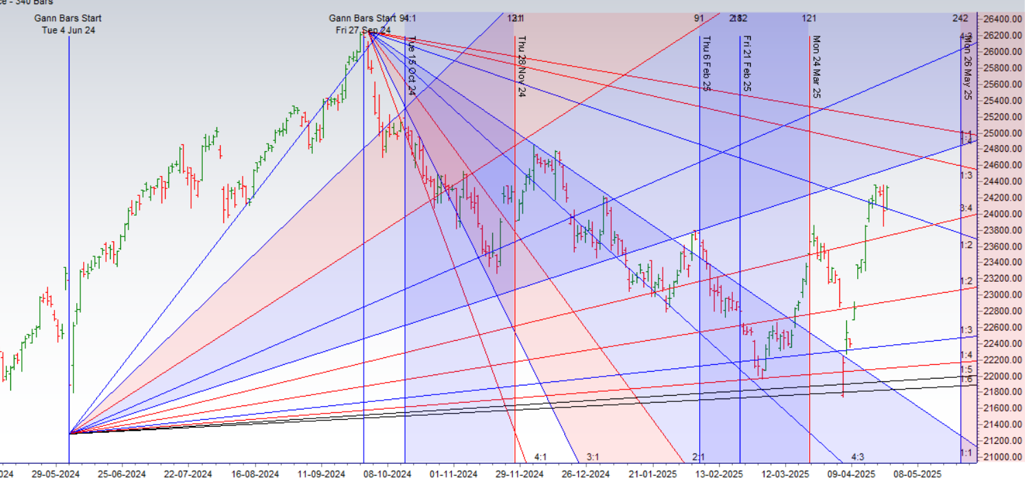 Nifty staged a strong comeback, erasing Friday’s fall, as the New Moon — a classic astro signal — triggered fresh bullish momentum. Price found support at the 1×2 Gann angle, a key technical level, and moved sharply higher, reinforcing the strength of the uptrend.