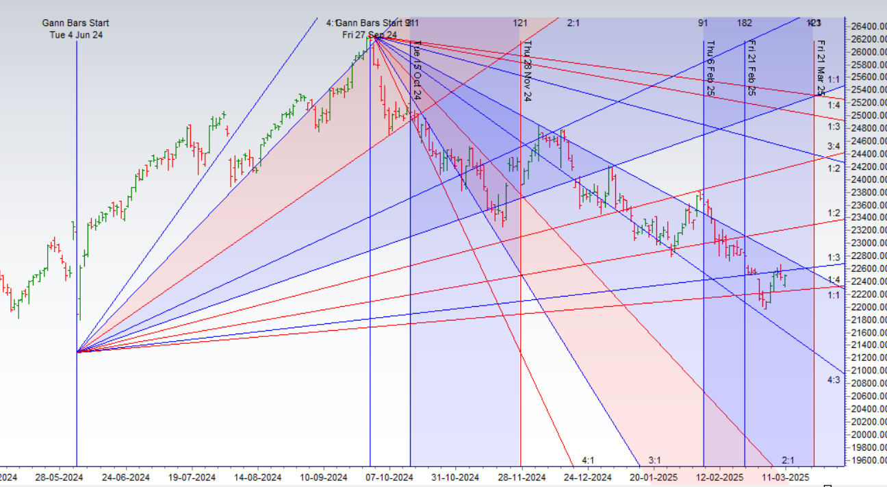 Nifty opened with a gap down but rebounded sharply as Venus-Mercury conjunction and support at the Gann Monthly TC level (22,336) triggered a strong rally, closing above 22,444.