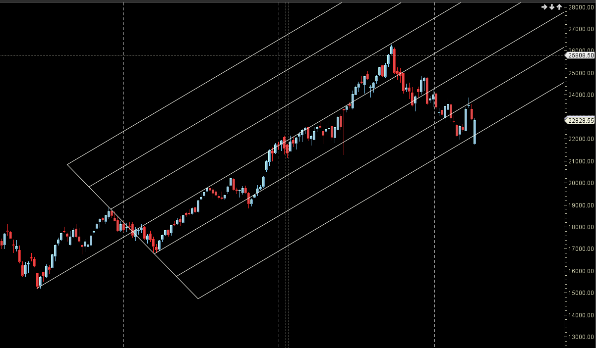 As per Gann any gap up opening due to global event can lead to gap fill in next few days, Strong resistance at 3×4 gann angle at 22600-22666, Support at 1×2 gann angle support at 22920-22954