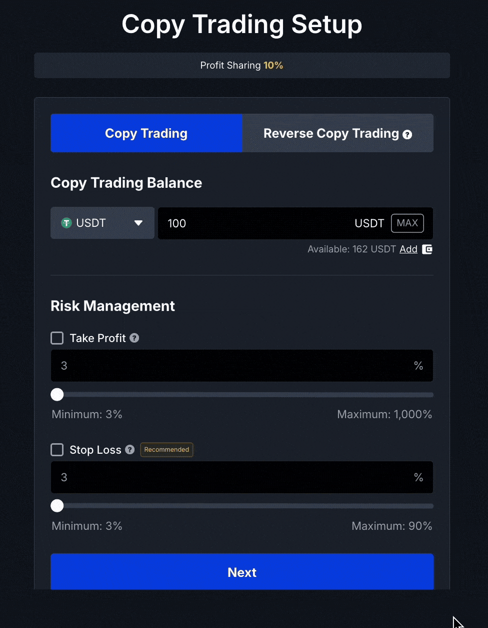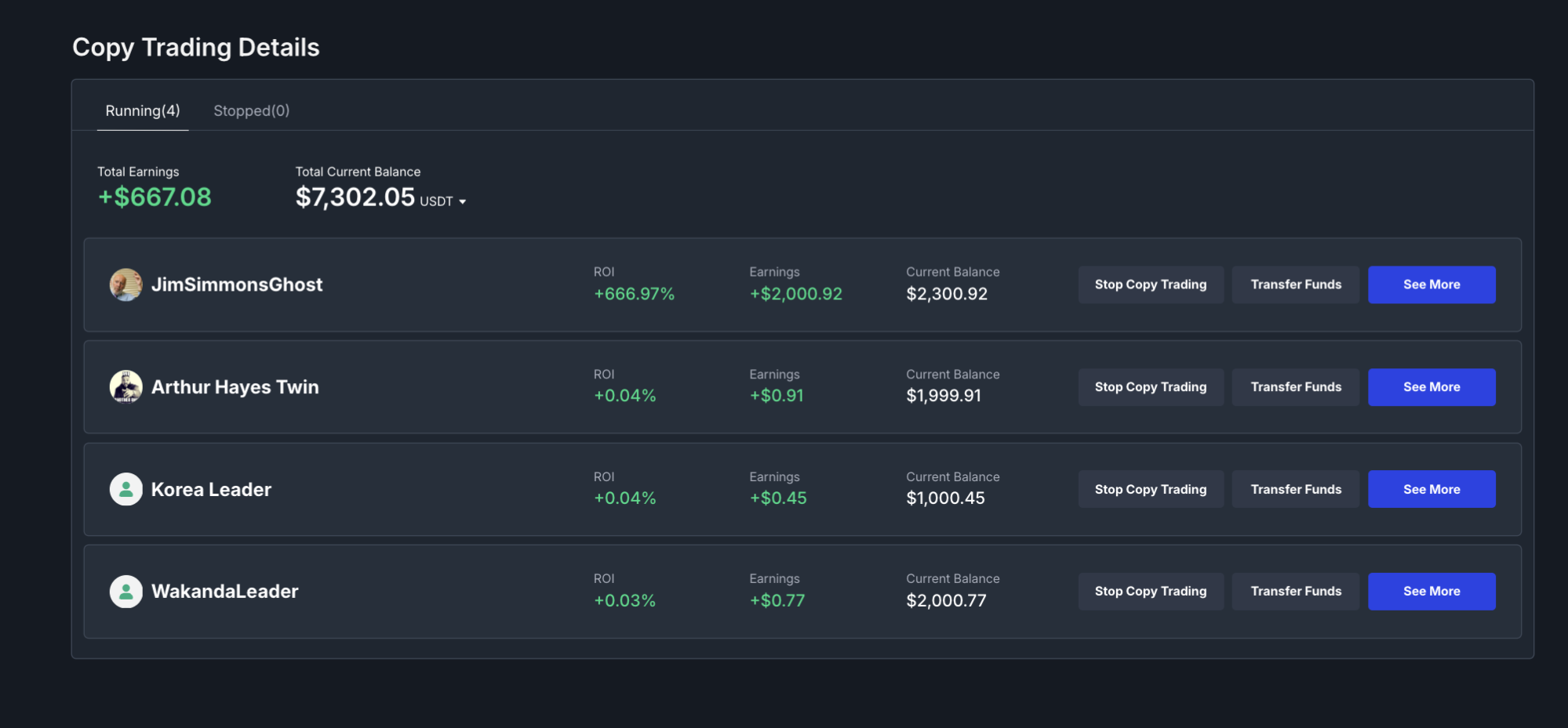 我们的跟单交易功能可让您复制顶级加密货币交易员的动向,确保您的投资组合即时反映他们的盈利,而无需时间限制或掌握复杂的交易策略。