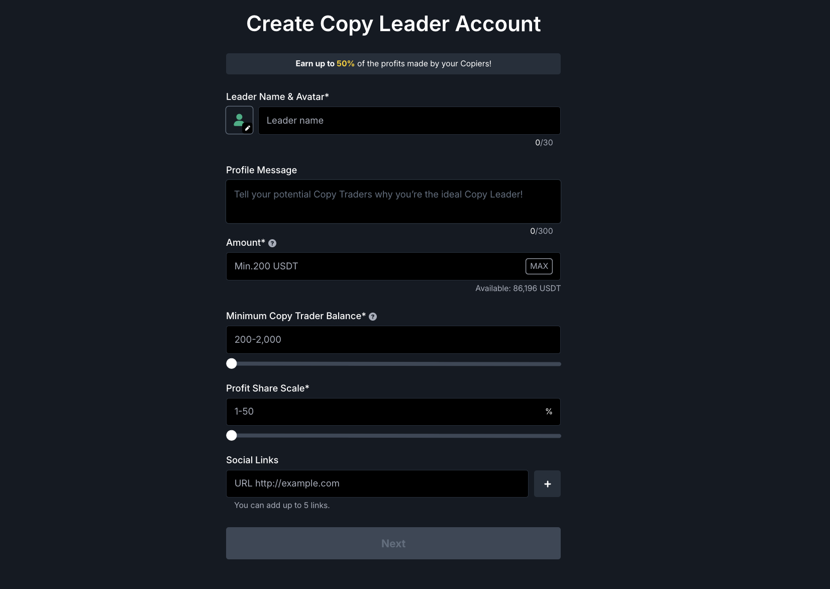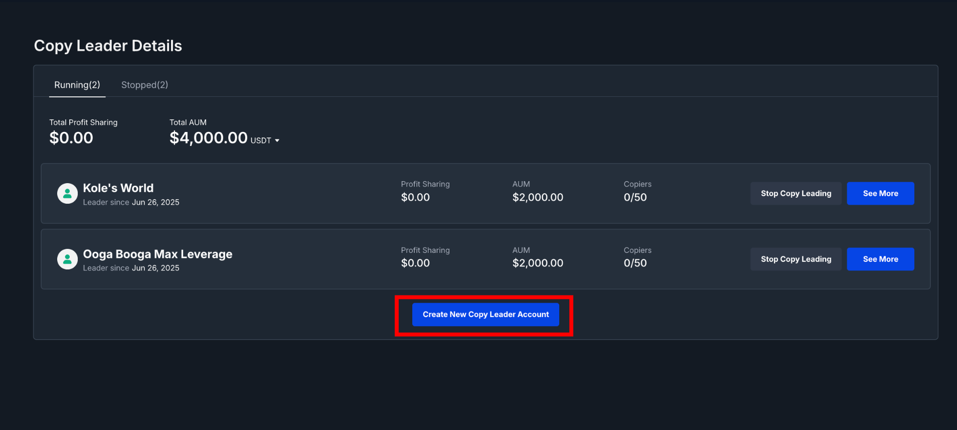 在创建新的带单员账户时,请输入您的交易余额分配、分润比例以及跟单者所需的最低余额等详细信息。有关成为带单员的更多信息,请参阅本文。