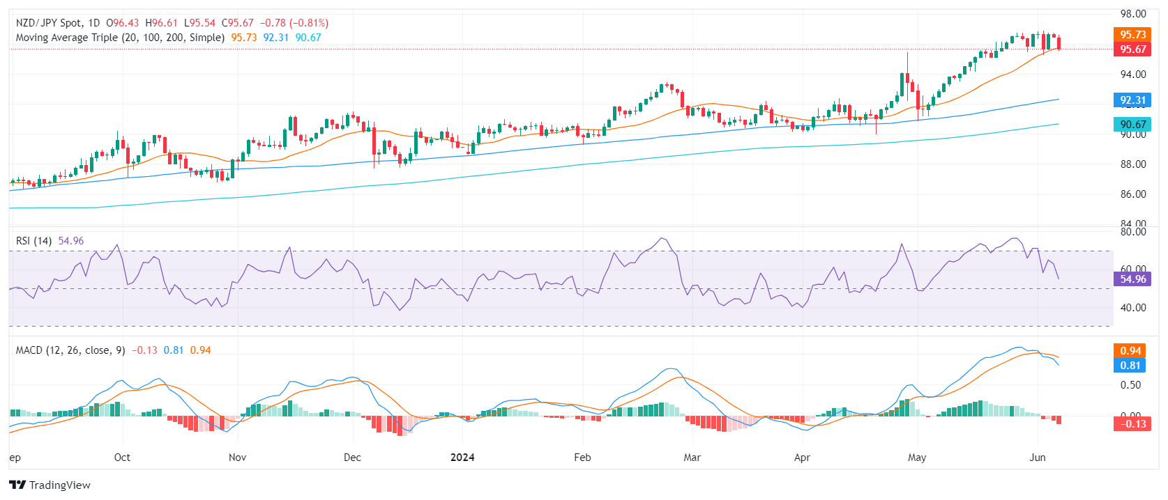 The Relative Strength Index (RSI) for NZD/JPY on the daily chart currently stands at 53, reflecting a decrease from the previous session’s RSI value of 62. The RSI’s movement towards the neutral zone, away from the oversold or overbought regions, hints at a moderation in buying pressure. Meanwhile, the Moving Average Convergence Divergence (MACD) has started to print rising red bars, indicating a growing selling momentum and reinforcing the possibility of extended consolidation or even possible declines.