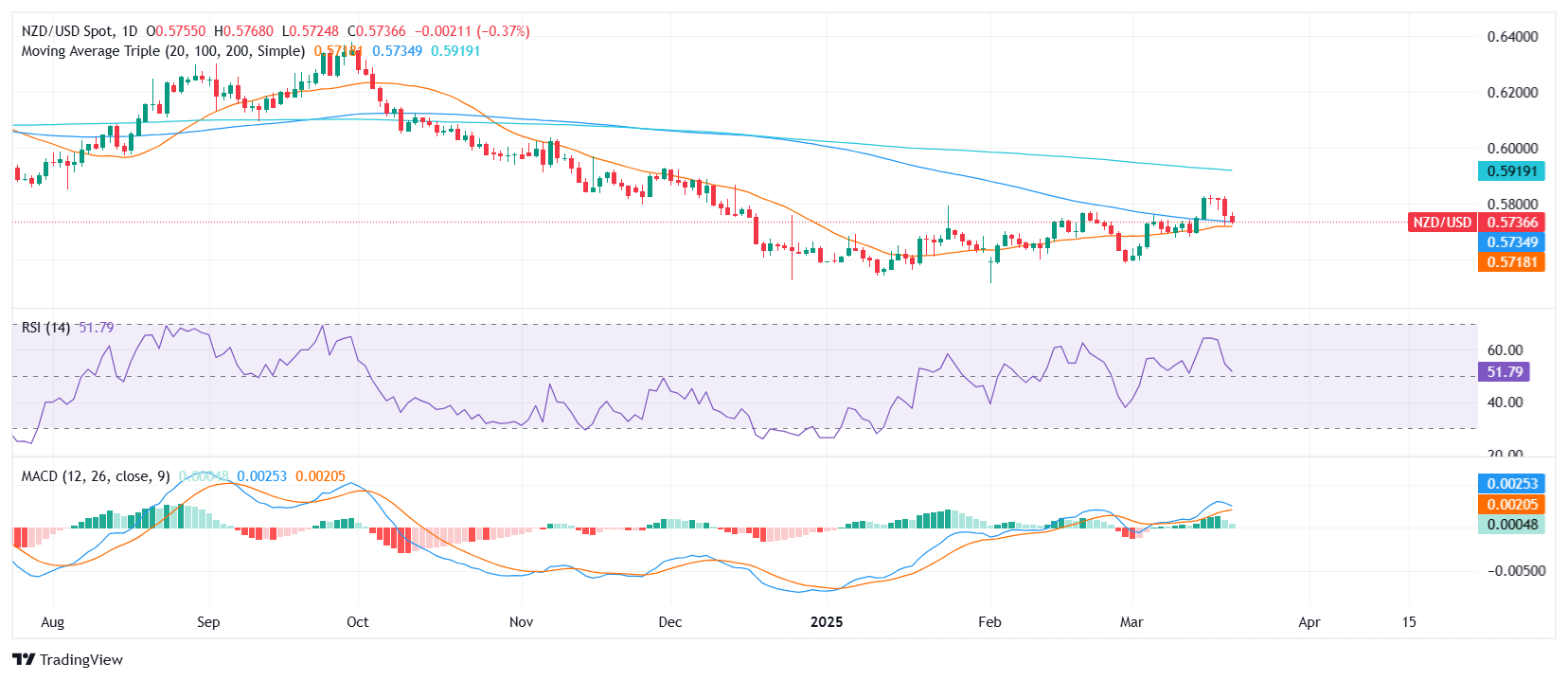 During Friday’s session ahead of the Asian open, NZD/USD declined modestly and was last seen hovering around the 0.5730 area. The pair remains under pressure after sellers stepped in earlier in the day, with price action now centered around the convergence of the 20-day and 100-day Simple Moving Averages—a key technical juncture for the short-term outlook.