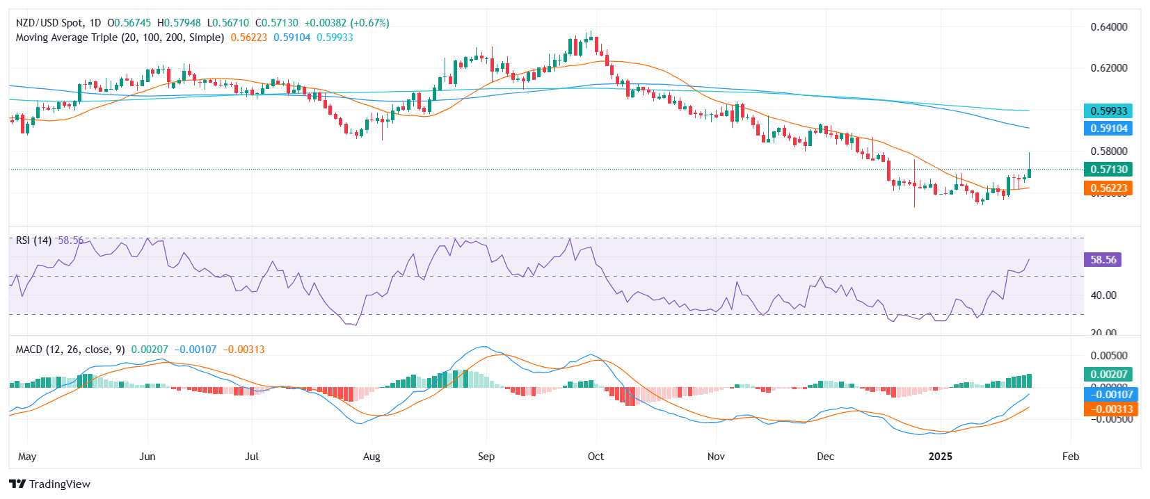 The NZD/USD pair continued its upward trajectory on Friday, rising by 0.44% to settle at 0.5705 and mantains its footing above its 20-day Simple Moving Average (SMA). This marks a steady continuation of the bullish momentum observed since mid-January, which was initiated by a breakout above the 0.5600 level. While minor pullbacks earlier in the week reflected potential profit-taking, the pair has maintained its position above 0.5700, signaling strong buying interest. On the negative side, the pair failed to sustain its intraday push near 0.5800.