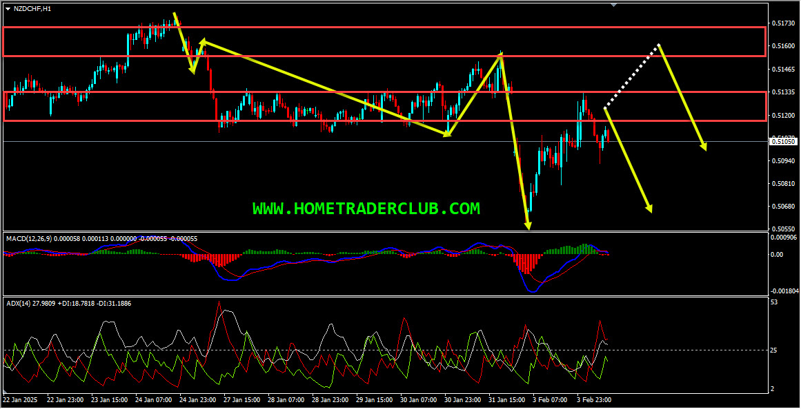 NZDCHF H1(1 Hour) Chart Analysis – Bearish Trend Pattern, ADX Indicator, Two Strong Resistance Zones