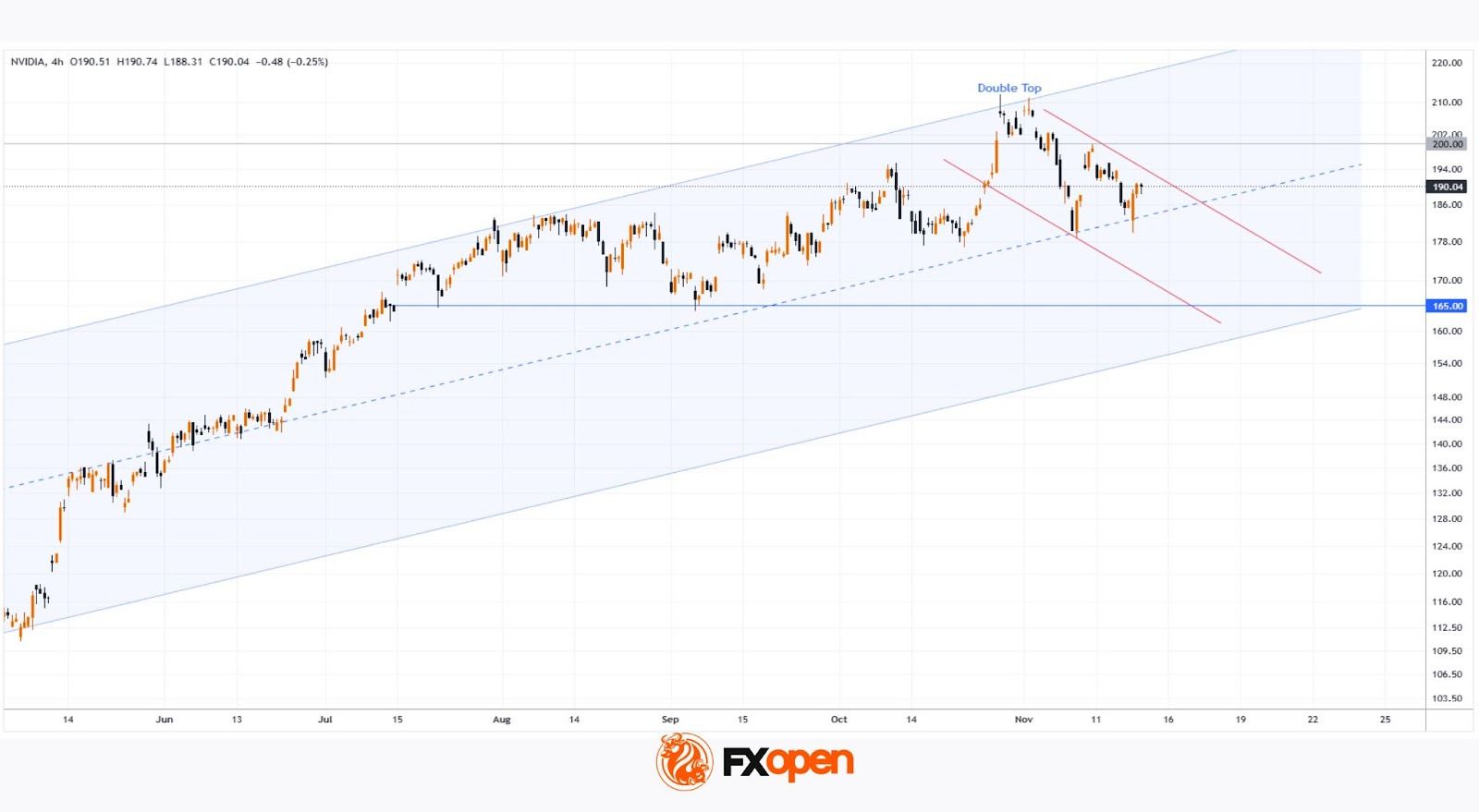 However, there is a risk that the market’s high expectations will not be met when the earnings report is published. If that happens, NVDA could extend its decline towards the lower boundary of the rising channel, where support lies near $165.