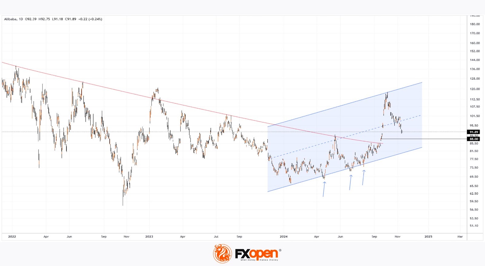 Tomorrow, on 15 November, Alibaba (BABA) will release its third-quarter 2024 earnings report. Analysts forecast a drop in earnings per share to $2.11 from $2.26 in the previous quarter.