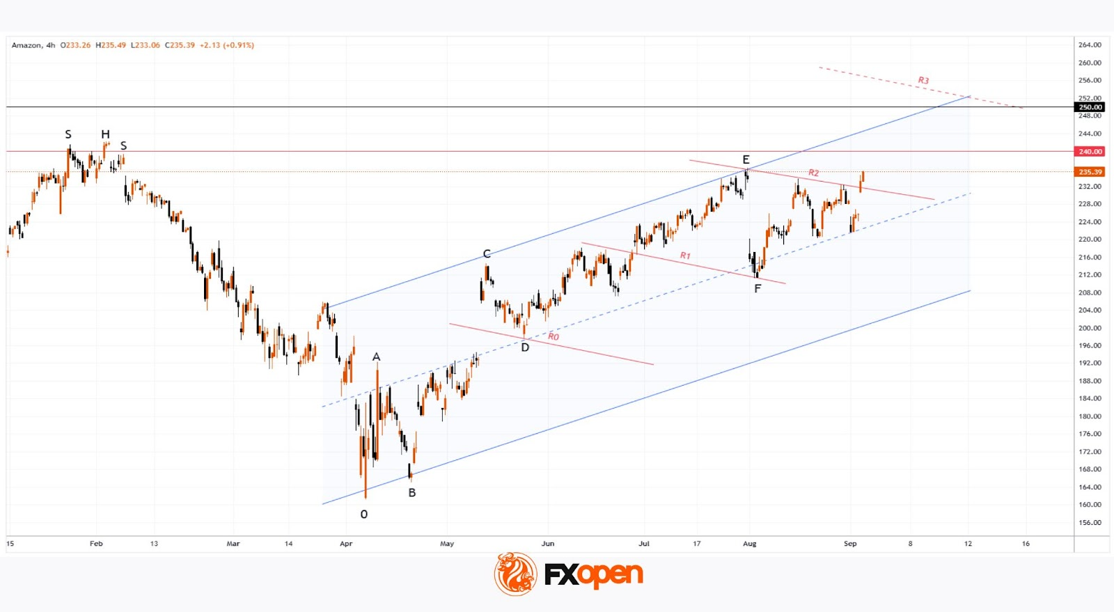 It is worth noting that AMZN’s upward momentum within the channel is unfolding step by step, making it possible to draw intermediate resistance lines R0, R1, and R2. In this context:
