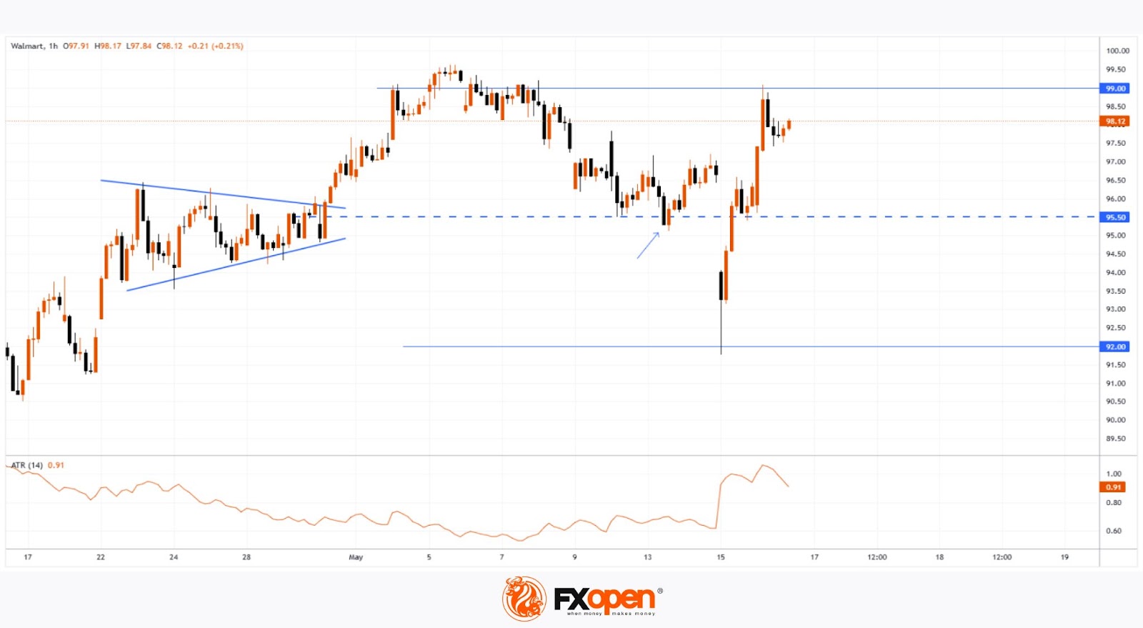 The earnings release triggered a spike in volatility — the ATR indicator is now at a one-month high. The Walmart stock price extremes seen at the end of last week suggest two key levels, roughly equidistant from the $95.50 axis: