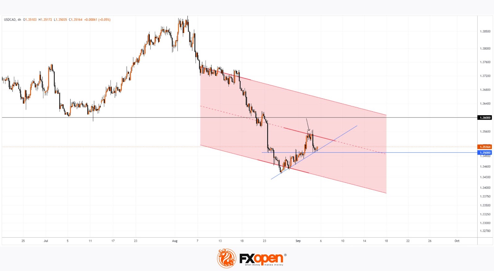 It is therefore reasonable to assume that the market is reaching a temporary balance between buyers and sellers, leading to fluctuations in the USD/CAD rate between the red median line and the 1.3500 level. However, traders should remain cautious of a potential resurgence in bearish pressure, which dominated throughout August, as the 1.3500 level could again act as resistance.