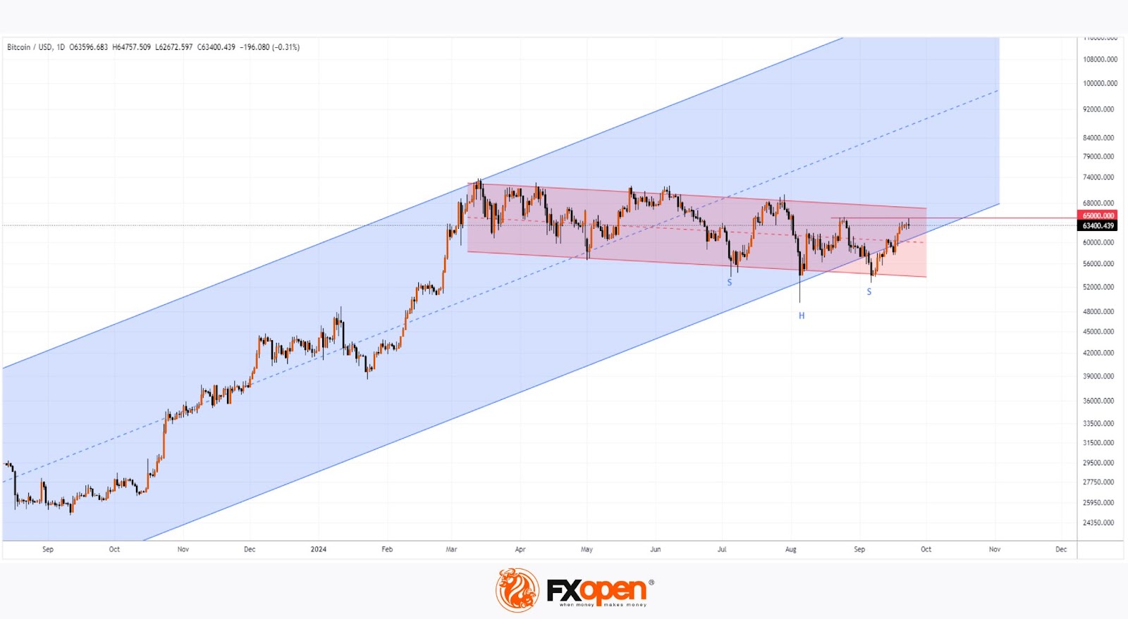A technical analysis of Bitcoin’s chart today shows that, from a long-term perspective, the BTC/USD rate is developing within an upward channel, indicated in blue, with the following key points: